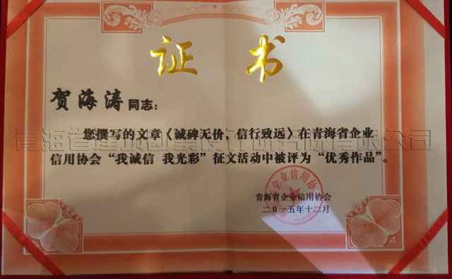 12月25日下午,由青海省企业信用协会主办的“青海省企业信用2015年度工作总结表彰大会暨2016年度诚信相约联谊会”在西宁召开。省相关厅局领导、会员单位代表、相关媒体等单位共计500余人参加了会议。我公司作为省信协会员单位也参加了本次会议的相关颁奖等。
