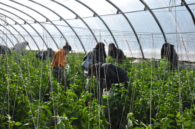一筐筐鲜红红、无污染,还略带露水的草莓终于被勤劳的双手从温棚内“解放”了出来,过秤,结钱。大家带着胜利的果实,又在另几个温棚收获了青椒、西红柿等蔬菜。