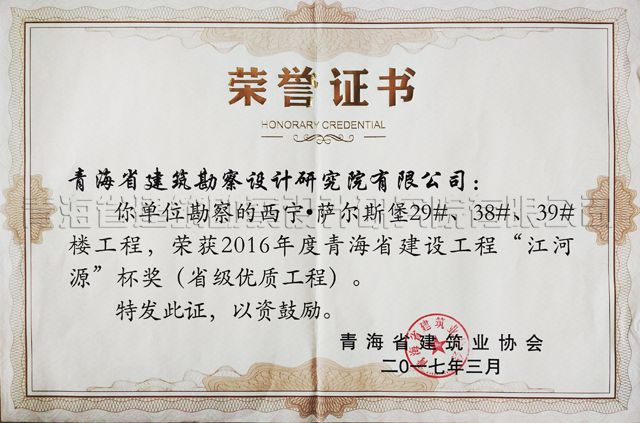我院岩土公司勘察的西宁• 萨尔斯堡29#、38#、39#楼工程,荣获2016年度青海省建设工程“江河源“杯奖(省级优质工程)。