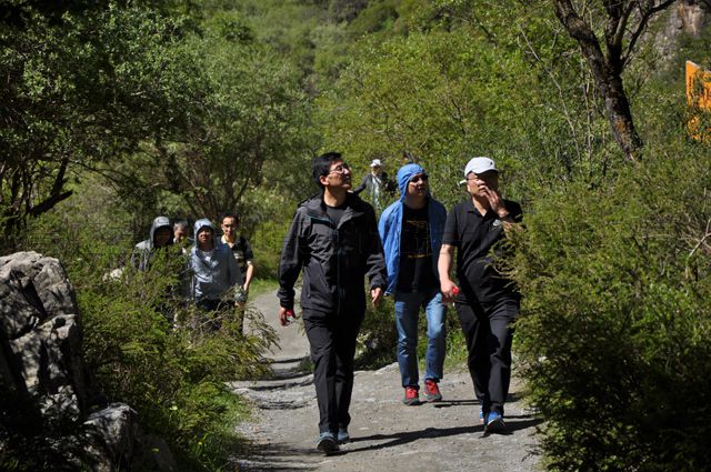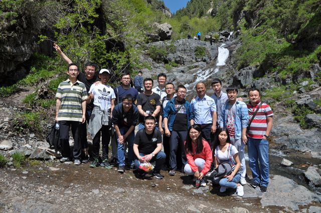 刚开始徒步时,大家还是以队为单位排列行走,走着走着,因山势越来越陡峭,队列就慢慢拉开了距离,随之不断变换出组合的多样性。站在一高处,俯瞰山下,逶迤的羊肠山路上,零星点缀着三三两两的红女蓝男,给这片幽静而清新的山林增添了几抹运动的色彩。沿途累了,大家稍歇息片刻,紧接着继续往上攀爬。山路一直是沿着察汗河水流的方向逆行而上,越往上走,路越难行,甚至有的路被荆棘丛生的植物遮掩,让你不得不停下来仔细辨析路的方向。耐力和毅力是保证到达察汗河瀑布终点的能量支撑,往返约7公里的路程,考验着每一位员工的自信力和坚持力。党员同志们更是发扬团队的凝聚力,大家相互勉励,不畏艰辛,以一个带多个,最终用以付出的汗水收获了终点的喜悦。站在终点的制高点,大家一起拍照,一起狂欢,一起感受瀑布的飞花四溅,一起领略察汗河的诗情画意。