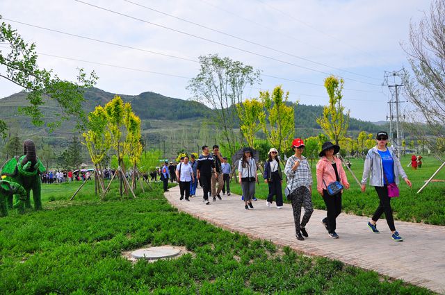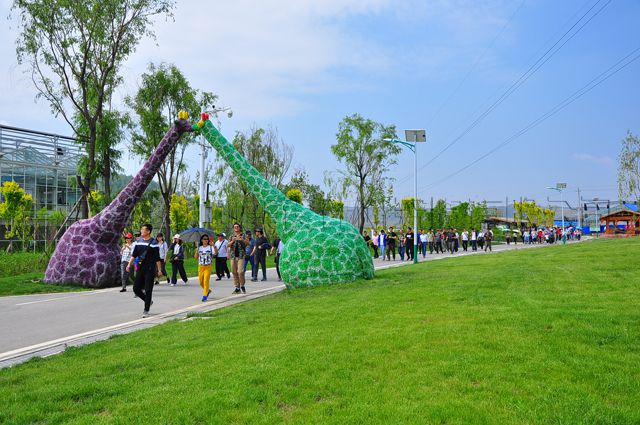 六月的高原,蓝天白云,烈日当头。适逢周末,游人如织,从出发地向景区中心地带挺进,徒步在景园的观景小道,处处姹紫嫣红,映入眼帘的是一大片一大片绚丽的迎宾花海。花海主题区地势呈中间高两边低的整体走势。广场、花海、雕塑、乡趣园等不同主题的区域花海,阡陌交错,异彩纷呈。大家在徒步旗手的引领下,在沁人心脾的花香牵引下,踏进极具田园色彩的大通汇丰景园。虞美人、丁香花、矮牵牛、孔雀草、万寿菊等二十余种时令花卉,与其间各类花塑形成姿态各异的适季鲜花景观,加上椒红葱绿的各色蔬菜园景观,在风车的催动下,犹如一幅铺向天际的流动画卷。满含泥土气息的五谷丰登与彩陶艺术雕塑,让我们仿佛置身于那个简单、古朴的年代,久远的文化、淳朴的民风与累累的硕果相得益彰,犹显自在天然。徒步其中,听自然和谐旋律,看轻风拂起麦尖,一处处田园风情蔓延开来,或耕、或碾、或织、或闲,时有乡土味十足的卡通形象和稻草人穿插其间,瓜田李下、留客人家,莺啼又燕舞,地沃而田肥,不禁唤起我们深藏在心中“守拙归田园”、“把酒话桑麻”的美好回忆。