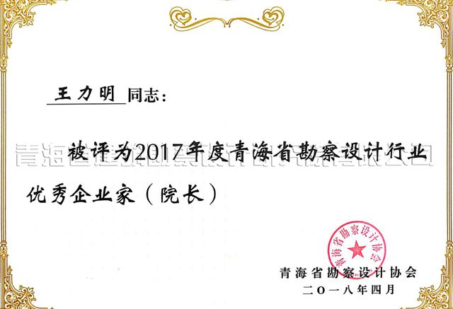 会上表彰了2017年度青海省勘察设计行业优秀企业和2017年度青海省勘察设计行业优秀企业家。我公司被授予2017年度青海省勘察设计行业优秀企业,董事长王力明被授予2017年度青海省勘察设计行业优秀企业家。