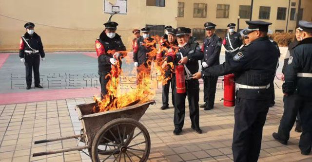 首先演练的是如何使用常用的灭火器。现场,一工地水泥推车充当了临时火灾现场,当熊熊的火焰燃烧起来时,保安迅速把目光切换到应急火灾场景,此刻面对的分明是如何快速灭火、救灾。张警官一边讲解灭火器的灭火原理,一边手把手地教保安该如何使用灭火器操作灭火。每一个步骤都是在遏制火情的关键,每一个程序都是在挽救受灾的生命。
